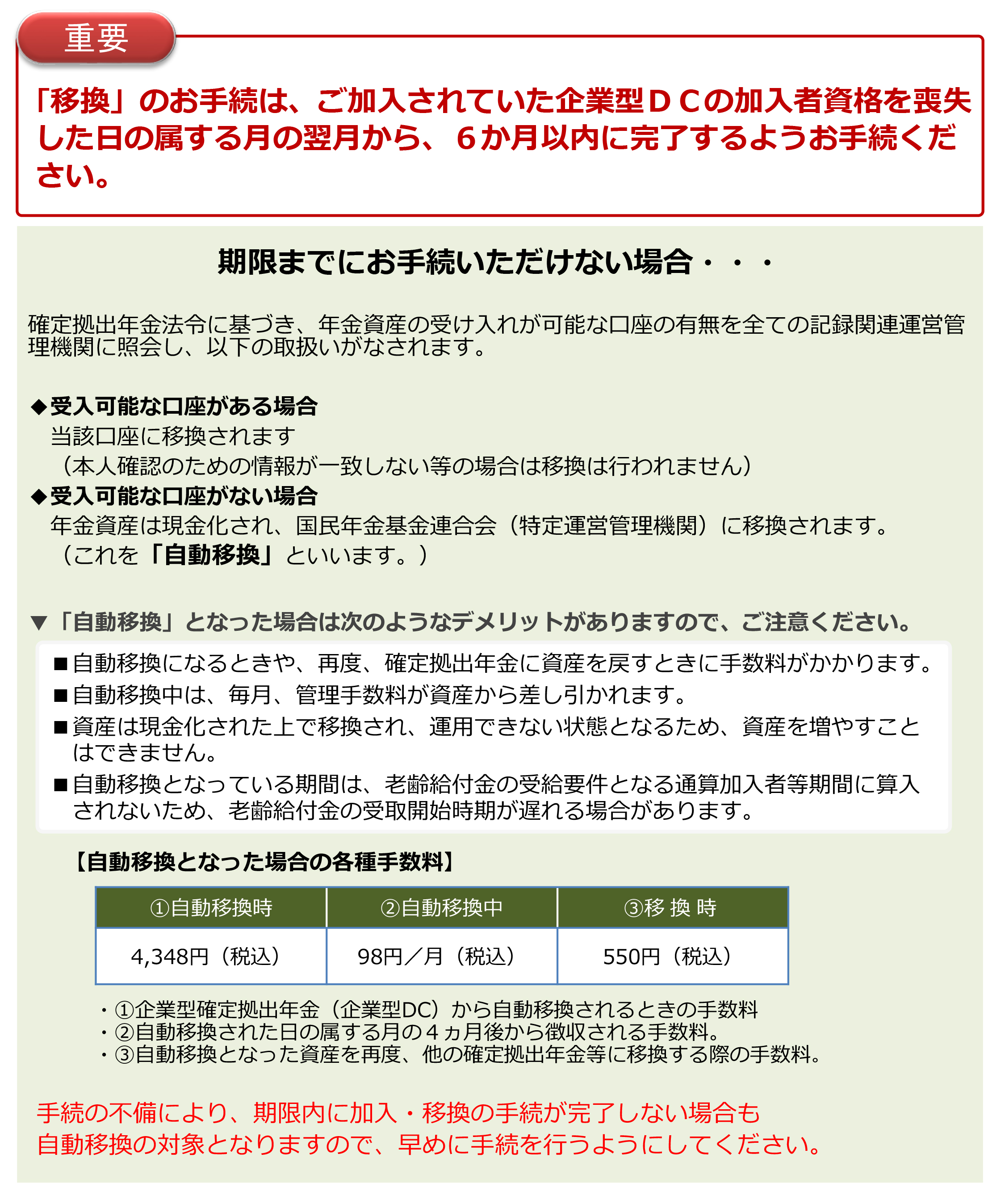 60歳未満で退職し、ご加入されていた企業型確定拠出年金(企業型DC)の加入者資格を喪失したときは、それまでに積み立てた年金資産を転職先の企業型DCまたは個人型確定拠出年金(iDeCo)に移すお手続が必要です。(この手続を「移換」といいます。)